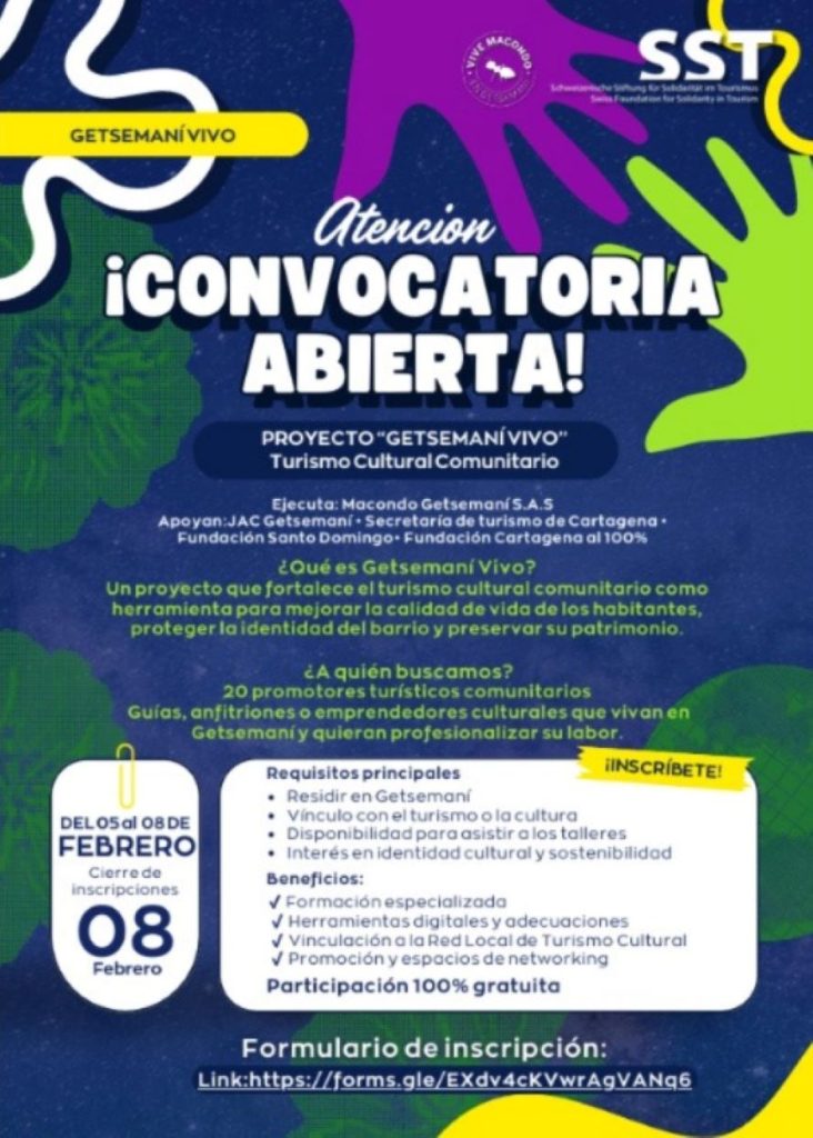 La convocatoria es organizada por la empresa Macondo Gestemaní S.A.S. la cual gestiona el proyecto “Getsemaní Vivo: Fortalecimiento del Turismo Cultural Comunitario” que busca potenciar las capacidades locales, proteger el patrimonio cultural y promover un modelo de turismo sostenible con la comunidad como protagonista.
